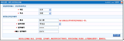 d) 请考生特别注意,您在此处输入的姓名和证件编号将作为您成绩单及合格证书的标识,请认真填写。报名信息填写完毕并保存后将无法修改,如填写有误,请重新注册、重新填报信息。见下图: