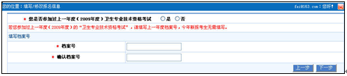 | 上一年度考生档案号 | 参加过2009年度全国卫生专业技术资格考试暨护士执业资格考试的考生,请填写2009年度使用的档案号或姓名和证件号,以保证您的成绩能够正常滚动。 (特别提示:2010年度护理学(士)各科目最后一年实行滚动管理,自2011年起报考该专业的考生须参加全国护士执业资格考试,对2010年度考试成绩不再进行滚动管理。) |